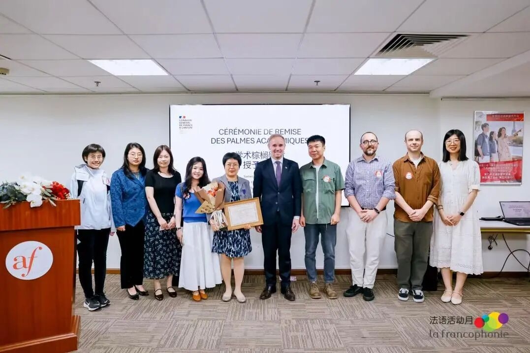 3月28日,法国学术棕榈骑士勋章授勋仪式在广州法语联盟举行。法国驻广州总领事Laurent Legodec(罗宏灵)代表法国国民教育部授予我院法语系主任曾晓阳教授法兰西共和国学术棕榈骑士勋章(Chevalier dans l’Ordre des Palmes académique),以表彰其在法语教学与研究、中法文化交流及高等教育合作领域的突出贡献。我院法语教师代表出席授勋仪式。