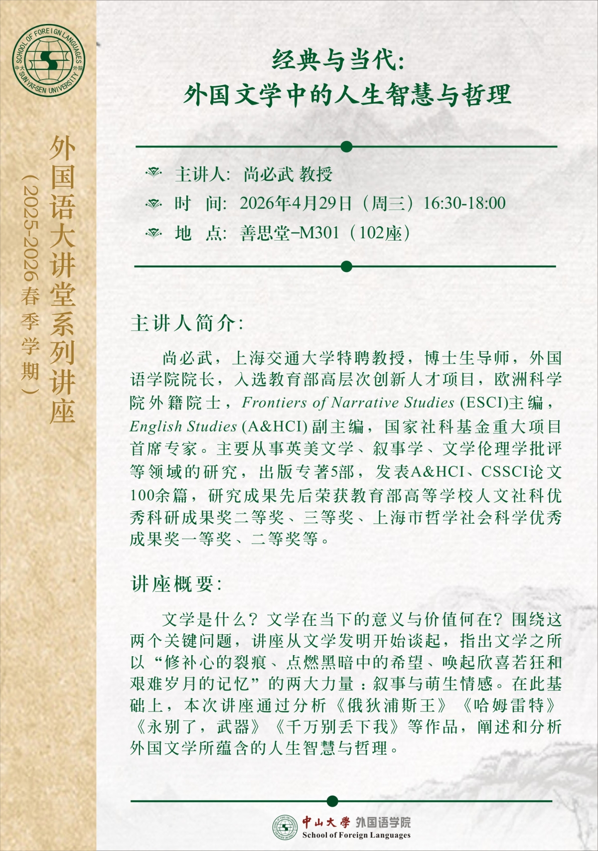 导航痕迹 在线博彩 经典与当代:外国文学中的人生智慧与哲理 扫描此二维码分享 经典与当代:外国文学中的人生智慧与哲理 发布人:罗锦芬 发布日期:2026-04-21 活动时间 2026年04月29日 16:30 - 2026年04月29日 18:00 活动地址 善思堂M301 主讲人 尚必武 教授